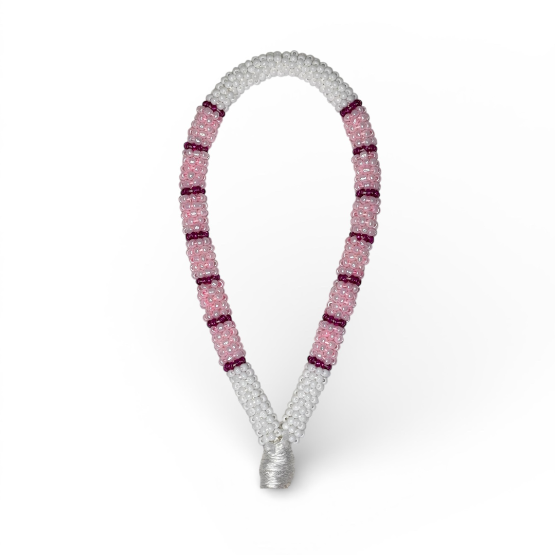 Handcrafted pink and white beaded wristlet. Stylish, functional, and perfect for hands-free convenience.